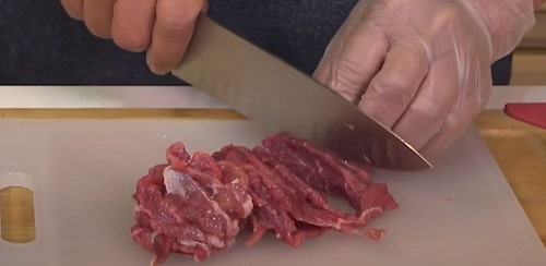 + Thịt thái mỏng cho vào tô và đập trứng gà cho vào thịt (chỉ lấy lòng trắng)